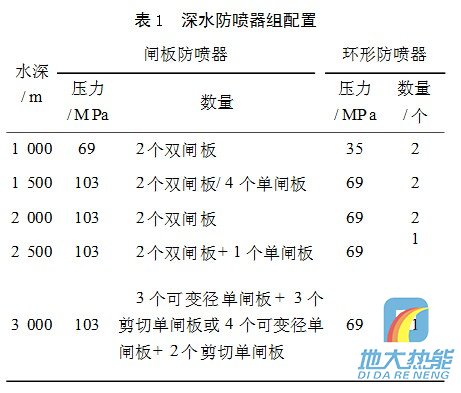 水下防噴器是海洋石油鉆采過程中用于防止井噴發(fā)生的專用設備,上部連接隔水管裝置,下部連接海底井口裝置。深水防噴器組通常有5個閘板和2個萬能防噴器組成,第5個閘板即底閘板可以剪斷套管,套管剪切閘板位于盲板的下部,以便在剪斷套管后可以關井,通常在套管可能遇卡或者鉆井裝置需要應急脫離時會用到。2個萬能防噴器是冗余設計的需要,上部萬能防噴器作為井控的主要手段。根據(jù)水深的不同,深水防噴器組通常有不同的配置。表1是在總結(jié)Transocean公司所有不同水深典型鉆井船防噴器組配置情況得出的,可以作為深水鉆井防噴器組配置的參考。 對于浮式鉆井裝置(半潛式平臺或鉆井船),選用防噴器系統(tǒng)的通徑為?476.3mm(工作水深<600m)或?425.5mm(工作水深>600m),選用封井壓力為69、103、138MPa時,視工作水深、海底至目的層深度和是否為特殊高壓的油氣層而定。為了適應欠平衡鉆井的需要,井口防噴器組合要配置高壓旋轉(zhuǎn)防噴器,即隨鉆壓力控制系統(tǒng)PCWD(Pres2sureControlWhileDrilling)。
