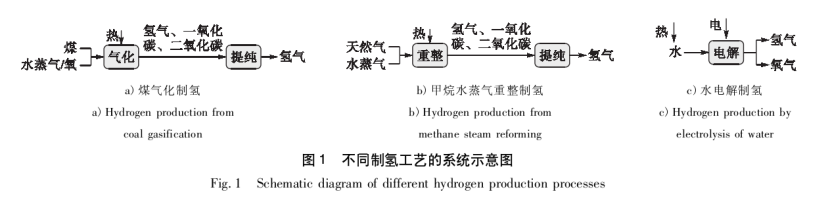 熱化學(xué)工藝通常需要高熱,例如:煤氣化制氫的氣化溫度,對(duì)于濕法料漿氣化技術(shù)為1 250~1 400℃,干法粉煤氣化技術(shù)為1 400~1 700℃;甲烷水蒸氣重整制氫, 重整反應(yīng)的溫度通常為750~920℃;甲烷芳烴構(gòu)化技術(shù)目前還處于研究階段。煤氣化制氫和甲烷水蒸氣重整制氫都會(huì)產(chǎn)生溫室氣體———二氧化碳,通常稱為灰氫, 見(jiàn)圖1-a)~b)。這類制氫工藝與碳捕集結(jié)合起來(lái)產(chǎn)生的氫氣,通常稱為藍(lán)氫。